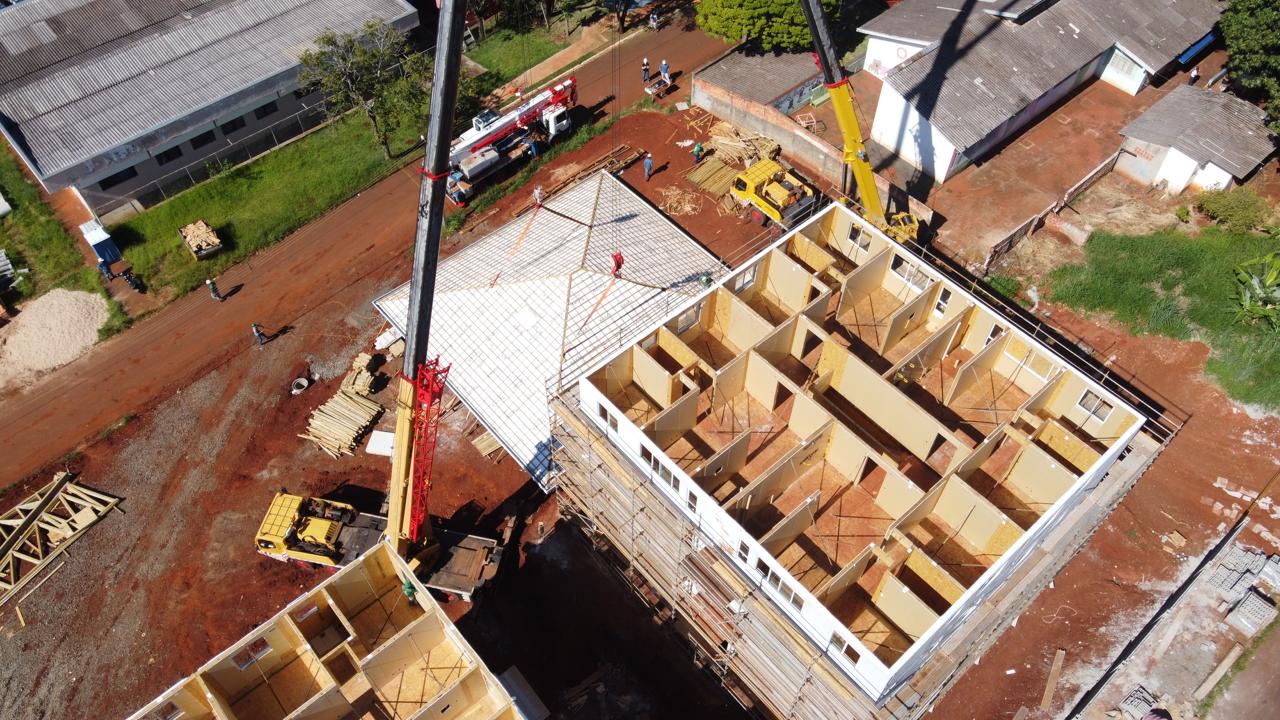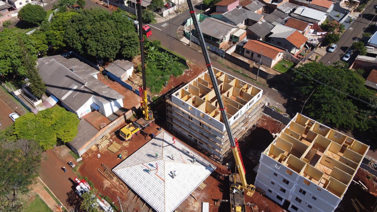 O Residencial Jácomo Violin – um empreendimento realizando pela Prefeitura de Londrina em parceria com a COHAB-LD e que contará com 48 apartamentos populares – está em estágio avançado de execução. No último dia 10, foi realizada a colocação das estruturas de cobertura no dois primeiros blocos, do total de três que integram o complexo habitacional.