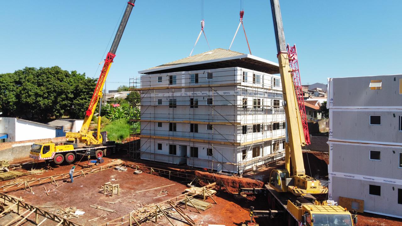 A colocação das coberturas dos prédios foi realizada por meio de dois guindastes de grande porte, com braços de 40 metros de altura, aproximadamente. Esse modelo estrutural segue o projeto de construção do empreendimento, desenvolvido no sistema construtivo Wood Frame da Tecverde, que tem a madeira como matéria-prima dos componentes estruturais. O formato proporciona uma obra mais sustentável, econômica, com resultado moderno e de qualidade.